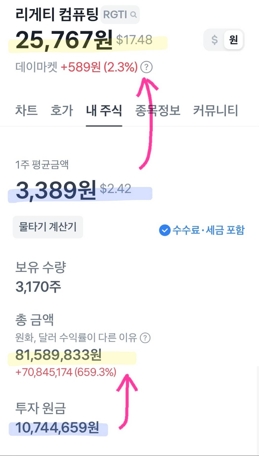 저는 양자 컴퓨터 테마에서는 리게티 컴퓨팅에 투자를 하고 있습니다. 1주에 3,389원(2.42달러) 정도에 1천만원을 투자했는데, 현재 주당 25,767원(17.48달러)으로 성장했습니다. 금액으로 보면 현재 약 8천만 원이 되었습니다. 1천에서 곧 1억이 될 날이 머지않았네요. 1억이 10억이 되는 날까지 팔지 않고 제 2의 엔비디아의 기적을 직접 경험해보려고 합니다. 저는 그렇게 되는 시점을 2027년에서 2032년 사이로 예상하고 있습니다. 기대됩니다.