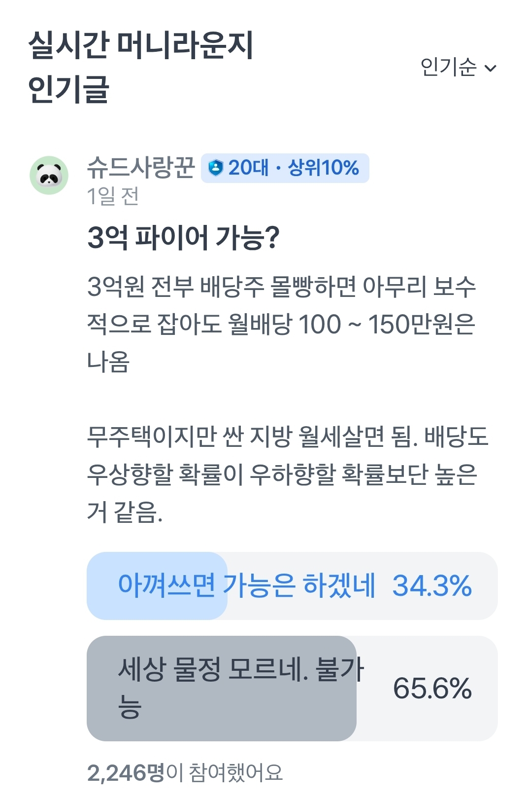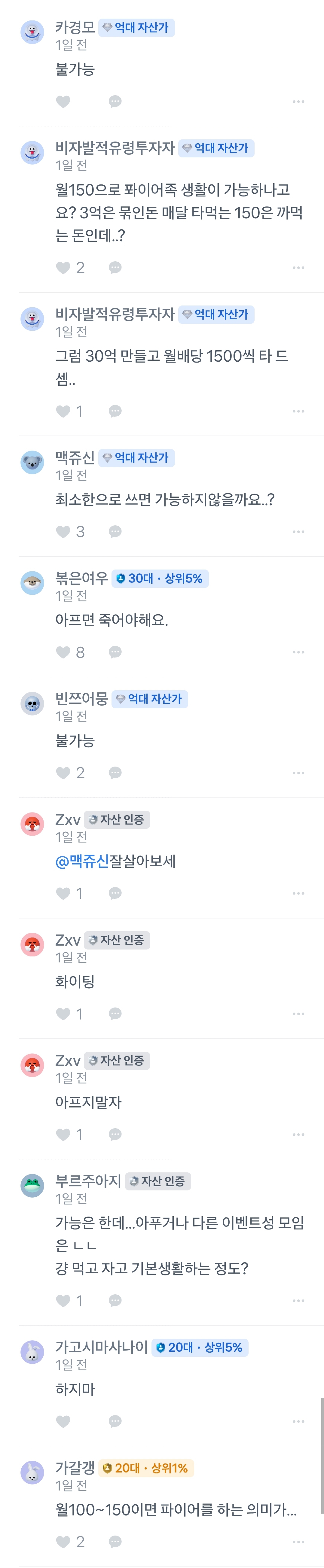 배당주 ETF만 잘 선정하면 투자금 7천만 원으로도 월 200만 원 정도의 배당은 가능하기 때문이다. 뭐.. 이 이야기는 뒤에서 다시 하기로 하고 커뮤니티 내 답변들이 재밌다. 역시 억대 자산가님들의 조언은 현실적이다. ㅎㅎ